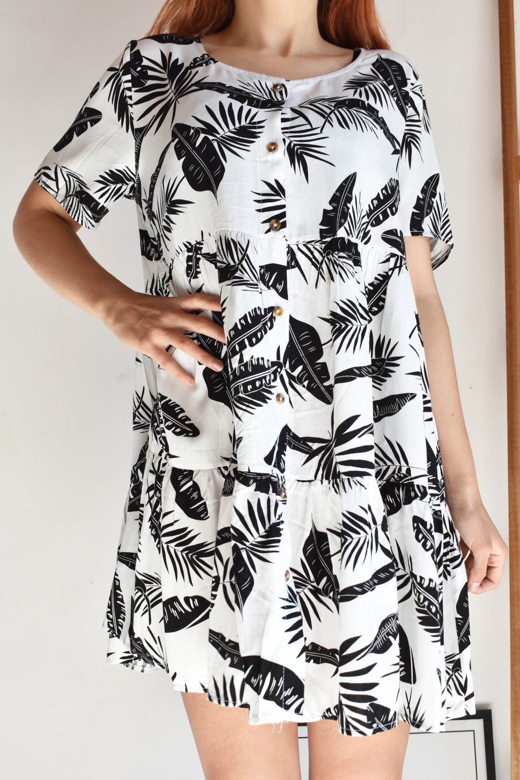 VESTIDO DE FIBRANA MANGA 3/4 ESTAMPADO. TIENE ESCOTE V Y SU CIERRE FRONTAL A BOTONES NOS PERMITEN LA COMODIDAD PERFECTA. NOPOSEE BOLSILLOS EN LA PARTE DELANTERA Y UN CORTE EN EL BAJO BUSTO QUE LE DA LA CAIDA IDEAL.