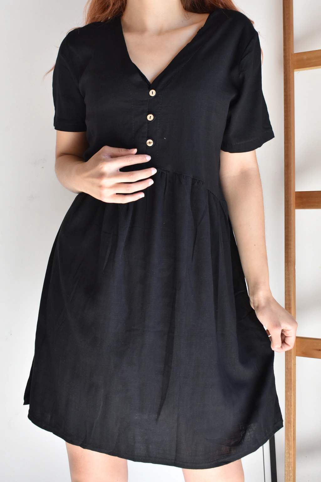 VESTIDO CORTO DE CUELLO REDONDO. POSEE DOS CORTES, UNO A LA ALTURA DEL BUSTO Y OTRO A LA CADERA GENERANDO UNA CAIDA IDEAL. EN SU PARTE FRONTAL TIENE 3 BOTONES DECORATIVOS Y SUS MANGAS SIMULAN UN DELICADO VOLADO. TALLE UNICO LARGO: 90 CM CONTORNO DE BUSTO: 102 CM CONTORNO DE CADERA: 170 CM SISA: 26 CM LARGO DE MANGA: 20 CM